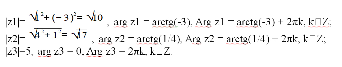Пример 1. Изобразить на комплексной плоскости числа z1 = 1 — 3i, z2 = 4 + i, z3 = 5, найти их модули и аргументы.